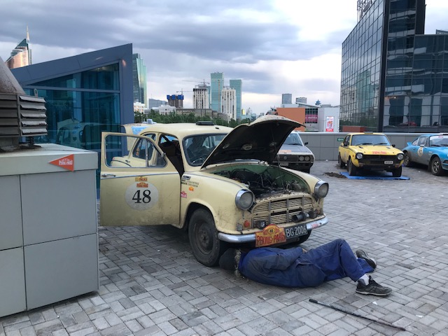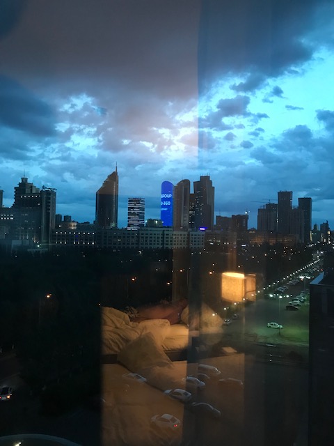A picture from the hotel window before dark. Steve working on the car in the hotel car park and the dirt from Denise’s bottom. Another shot of the city at night from hotel window